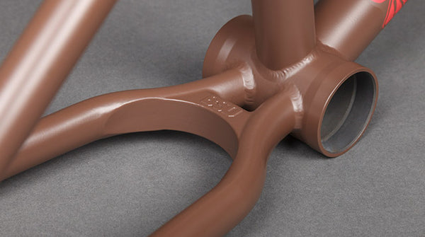 The Grime frame has an invest cast chainstay yoke which creates more clearance for the tire for when your wheel is slammed. Also because this part is cast and heat treated it strengthens the rear end of the frame by stiffening it up.