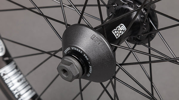The BSD CRBN-XLT Front Street Pro is one of the most advanced BMX front wheels available built for riders who want the best in performance and weight savings. It pairs the proven BSD Front Street Pro hub with push on Jersey Barrier hubguards combined with the new ultra-light CRBN-XLT carbon fibre rim for a fast, responsive ride.